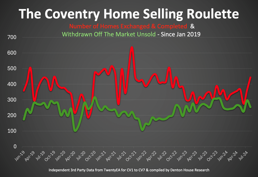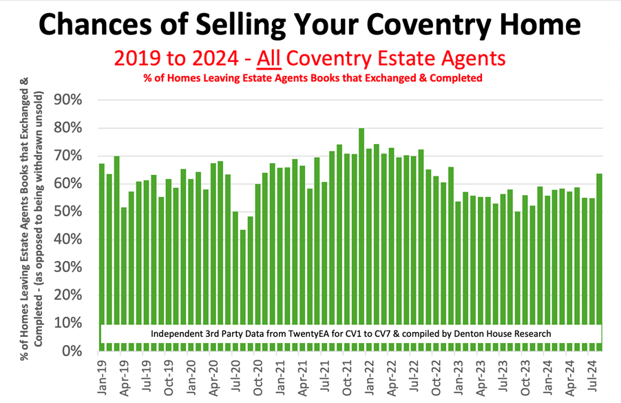 - In 2024 (YTD), 57.9% of the 4,799 properties that left Coventry estate agent books, exchanged and completed. The remaining 2,021 (or 42.1%) Coventry homeowners came off the market unsold.